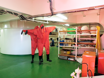 The bosun's compartment is at the bow of the ship, immediately below the foc'sle. The first day out I was given a tour of the ship and was startled to encounter these two cold-weather outfits hung out for easy access and to be dry. As part of the drill on day 2 I donned an immersion suit very much like this one, designed to keep one alive in cold water for up to 24 hours. Because almost no fuss is made over the passenger, you soon feel quite comfortable wandering the ship and asking questions. None of the staff has unusual amenities, so all share in the boredom. A couple of deck crew are working in the background.
