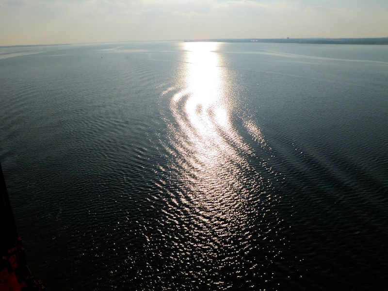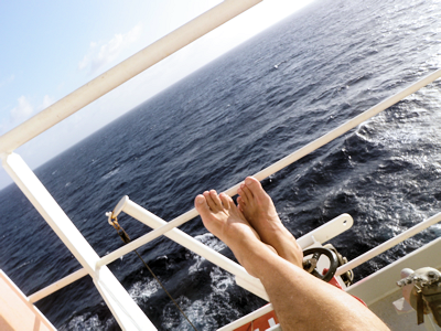 This is as close to a 'cruise' picture as I was able to take; trying to relax with my feet precariously balanced on a fire hose valve, sitting on a cheap plastic chair, the wind blowing cigar smoke in my face, the whine of the ventilators buzzing in my head. Still, it was a great adventure.
