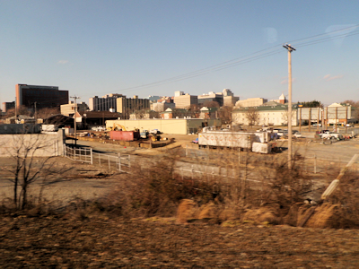 On the train from Washington DC to Newark NJ I noticed containers everywhere; here, center left, a red 40-foot container (or 'box' as they are known in the business) is behind a warehouse. If you are attuned to things they can become ubiquitous, like the container being used for some kind of enclosure at Rutgers University in Newark.