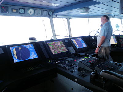 ![]() | Most of the ships I've been on were sailing vessels where the bridge consisted of a wheel and a compass, with charts, radar, etc. housed in a protected space. The Cap Jervis bridge looks more like a roomy space ship - until you look out the 270-degree windows. You see the two radars (set to the same view but they can be used independently) and the central 'dashboard' showing our position, heading, rudder angle, speed, distance to bottom, among other things. Here the First Mate talks to another ship confirming our intention to pass in front of the other vessel (starboard-to-starboard). Although I could freely walk about the bridge at any time, as a former US Coast Guard sailor I could never be completely comfortable there, and I always addressed the personnel by their titles: Captain, Mate, Cadet, etc. But I did spend a lot of time watching the sea, looking at the charts, and asking questions of the crew, who were almost consistently patient and even eager to explain things. |