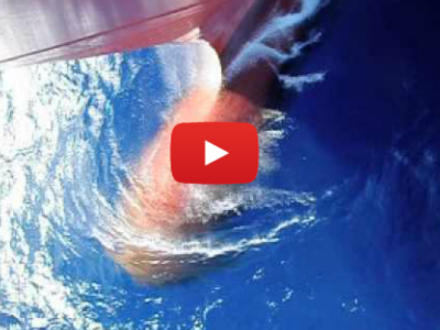 The huge bulb dramatically protruding below the prow of the ship seems rather ugly but results in significant fuel economy. When my wife saw this video she asked me if I was hanging over the bow for the shot: no, but I did have to lean over, and fortunately the captain didn't see me.