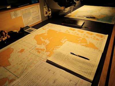 Behind the control section of the bridge (and shielded from it by a curtain at night) is the navigation table where the log and a charted record of our course are kept. In the foreground is a piloting chart of the Atlantic and in the background a larger-scale chart of our immediate vicinity. Between them is my notebook where I recorded my own journal, sketches, calculations, etc. |