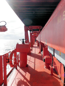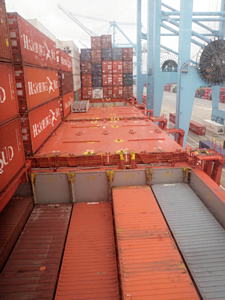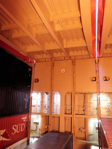 All of the interior of the ship except the accommodation is devoted to the holds, which can be packed with containers. I spent an afternoon with a cadet as he visited the refrigerated 'reefer' containers to check their temperatures, which must be noted twice daily. We gained access to the boxes along the passageways seen across this view, which shows an unusually large amount of free space. Note the grooves into which the boxes fit, and the hatch covers between which daylight is shining.
