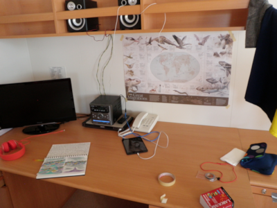 This is my entertainment center. I had to rewire the audio player for the ship's sockets and extend the speaker wires so that they could be placed on the shelf above. One evening I watched a video that didn't hold my interest, but I would listen to music as I wrote or sketched in my notebook.