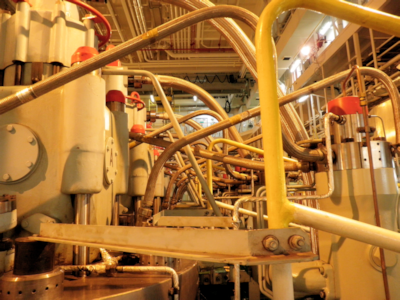 The engine 'room' is the largest single space within the ship; in fact the vessel is built around its diesel engine. A few days out of Florida I was given a tour of the engine room by the Chief Engineer, who spent a couple of hours lovingly pointing out all of the features of this extremely complicated system of motors, valves, controls, and other mysterious machinery. The main engine is an 8-cylinder diesel that ran at a constant 90 RPM for a week as we crossed the Caribbean and coasted NE Brazil.