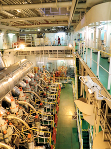 ![]() | After I'd been given an official tour of the engine room by the Chief I was able to visit this space on my own to study the machinery and photograph its abstract beauty, so long as I wore coveralls, proper shoes, and ear protection. In fact, on my first visit I was made slightly ill by the vibration and the sound (and perhaps the slight smell as well); but I found it thrilling to wander among the bizarre shapes and throbbing machinery, and to chat with the engineers, who could take refuge from the heat and noise in the control room. I put my hand on one of those hot but not burning silver hoses and felt the fuel being injected into the cylinders. |