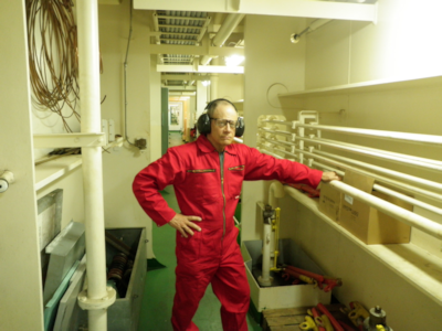 I close the journal with two pictures of me and a video clip. This is a shot of me taken while accompanying a cadet on an inspection of the holds. I think of it as my 'Chief Alarm Monitor' portrait. I was offered the brilliant red coveralls which I did indeed covet, but couldn't add them to the few items of tropical clothing I was taking to Pernambuco (in fact I left a few items of cold weather clothing aboard for the crew to pick over).