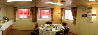 This panorama of the Officer's Mess illustrates the plainness yet relative comfort of the interior. Although the forward window looked out on the boxes, I could see the sea over the captain's left shoulder.