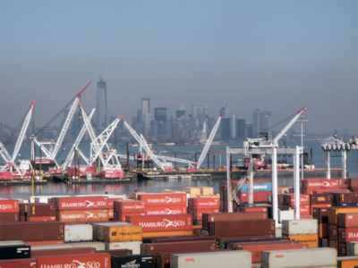 This is a view of the New York City skyline (including the beckoning Freedom Tower) from the Bayonne NJ container port, where Cap Jervis was being loaded with containers and its only passenger for the trip to Brazil. From here we headed out to sea under the Verrazano-Narrows Bridge, an impressive sight that I witnessed that night from the fo'c'sle at the bow of the ship, reached by gingerly negotiating 600 feet of deck 40 feet above New York harbor.