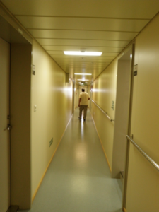 Just as the exterior of the ship is naked engineering with no design feature yielding to esthetics, so is the interior completely utilitarian, with almost no concessions to decoration. Each of the passageways of the accommodation block looked like this; in order to know which deck I sought I'd remember how many levels to ascend or descend (I just remembered the 'Saturday Night Fever' band and headed for decks B and G: the mess and my room, respectively).