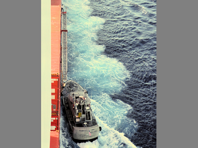 This view greeted me when I was dropped off by the container port's security van: no smiling steward with a glass of champagne, just a small-looking man in overalls beckoning me up a very long and jumpy ladder.