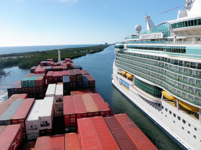 The trickiest piloting was here at Port Everglades (where the tug's line parted) especially as we had execute a 110 degree turn to pass this floating hotel. Liberty of the Seas (silly name) is about 1/4 longer than Cap Jervis and 4 times wider, but they are of similar height, as you can see here.