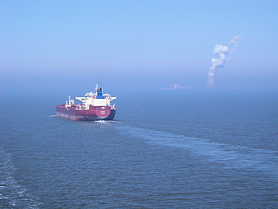 From February 13 to 22 the ship loaded and unloaded at 6 US East Coast ports, which entailed often complicated river navigation during which there was a lot to see. Here a tanker is passing us port-to-port with a red channel buoy to its starboard ('red right returning'). As all the pilots know one another, they'll go out on the port flying bridge and wave, perhaps even chat on their cell phones. When the pilot settled in aboard and if there were a lull in the action, I would introduce myself by saying: "I'm the passenger - all these boxes are just for show!" The pilots were friendly fellows (there was one woman) some of whom seemed actually envious of my adventure.