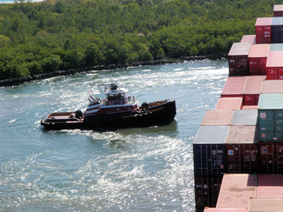 As we approached or left the dock tugs push and pull the ship, and are ready to nudge the vessel as be needed. A few minutes after this picture was taken in Ft Lauderdale that line parted and the bow was adrift. The danger of this situation is due not only to a loss of control, but also to the fact that a snapping 3-inch line can whip around with tremendous force, causing serious injuries. I was on the bridge listening to the urgent but calm exchanges between the pilot, our captain, and the tugboat master; later the pilot said it had been 10 years since he'd had a line part.